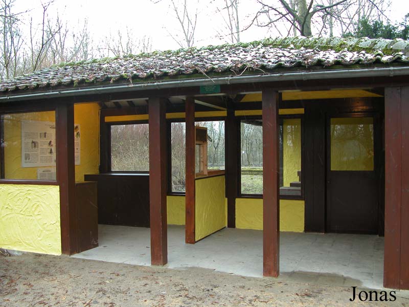 Plusieurs vastes volières forment une entité géométrique. L'aménagement intérieur de ces structures fait appel à une importante végétation. Plusieurs espèces d'oiseaux y sont présentées : grand hocco (Crax rubra rubra), ara macao (Ara macao), harfang des neiges (Nyctea scandiaca), grand-duc d'Europe (Bubo bubo bubo), chouette lapone (Strix nebulosa), chouette de l'Oural (Strix uralensis), vautour moine (Aegypius monachus), pigeon du Pérou (Columba oenops), ibis rouge (Eudocimus ruber), pigeon à queue barrée (Columba fasciata) et buse aguia (Geranoaetus melanoleucus).