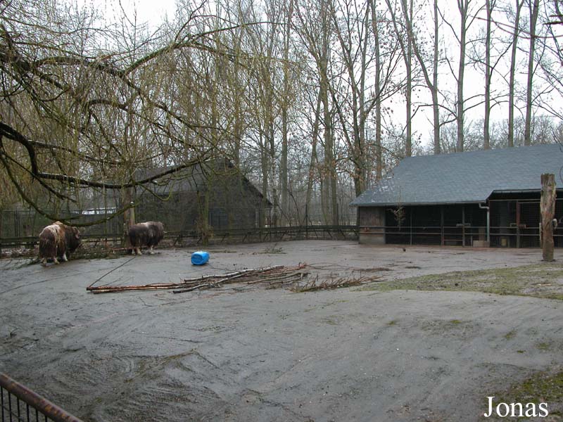 Une allée parallèle à la première longe une série de cinq enclos. Des boeufs musqués (Ovibos moschatus wardi), espèce peu courante en captivité, sont présentés dans le premier enclos. Le sol de celui-ci est en partie macadamisé pour permettre une usure optimale des sabots de ces animaux. Des rennes (Rangifer tarandus) et des anoas (Bubalus depressicornis) vivent dans les enclos suivants tandis qu'un couple d'élans d'Europe (Alces alces alces) occupe un enclos de plus grande taille, agrémenté d'un profond bassin. Des ânes du Poitou (Equus asinus) se trouvent dans le dernier enclos de l'allée.