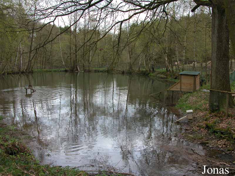 Le visiteur atteint ensuite le fond du vallon et se trouve ainsi dans la partie la plus basse du parc. L'enclos des sangliers d'Eurasie (Sus scrofa) est de forme triangulaire, densément arboré et pentu. Un dispositif de triage, en entonnoir, permet de contrôler la population des sangliers en temps voulu. A gauche du sentier se trouve un plan d'eau où évoluent quelques oiseaux aquatiques.