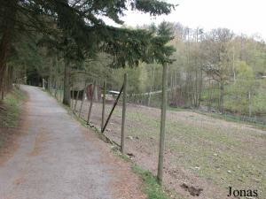 Une ancienne structure, abritant il y a une dizaine d'années la meute de loups du parc, est située un peu plus loin sur la droite. L'installation, entourée de hautes grilles, est aujourd'hui divisée en trois enclos distincts. Le premier abrite un renard roux (Vulpes vulpes), animal craintif difficilement observable. Le deuxième, aujourd'hui inoccupé, fut le lieu de vie d'un couple de chiens viverrins (Nyctereutes procyonoides), morts il y a quelques temps. Enfin, un renard polaire (Alopex lagopus) vit dans le troisième et dernier enclos. Des mouflons (Ovis orientalis) sont présentés dans un enclos situé sur la gauche du sentier.