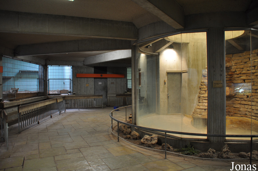 La vaste fauverie du Jardin Zoologique de la Ville de Lyon est également en mutation et a subi plusieurs rénovations au cours des dernières années. Inaugurée en septembre 1975, cette installation incluait initialement un bâtiment de 2300 m² et quatre cages extérieures pour panthères, quatre enclos entourés d'un fossé d'eau pour lions et tigres et un plateau pour des loups. Le bâtiment, fermé au public depuis le début des années 2000, était autrefois visitable et offrait la possibilité de découvrir quelques vivariums et cages pour petits mammifères nocturnes. Après avoir hébergé transitoirement plusieurs espèces dont des tortues puis des coatis, l'ancien plateau des loups a été complètement revu début 2012 pour accueillir une nouvelle espèce : des petits pandas (Ailurus fulgens). Les anciennes cages des panthères ont laissé la place en 2010 à deux nouvelles structures agrandies où vivent aujourd'hui des gibbons à favoris blancs (Nomascus leucogenys) et un couple de panthères de l'Amour (Panthera pardus orientalis). Du côté des lions, c'est maintenant la sous-espèce asiatique qui est présente depuis 2010 ; deux anciens enclos extérieurs étaient en cours de rénovation lors de ma visite en avril 2013. Leur rapprochement offrira bientôt un espace agrandi pour les fauves. Le dernier tigre de la fauverie occupe un autre des enclos extérieurs, tandis que le quatrième enclos, non visible du public depuis la pose de l'enceinte extérieure en 2009, sera bientôt le lieu de vie d'un couple de manuls (Otocolobus manul).