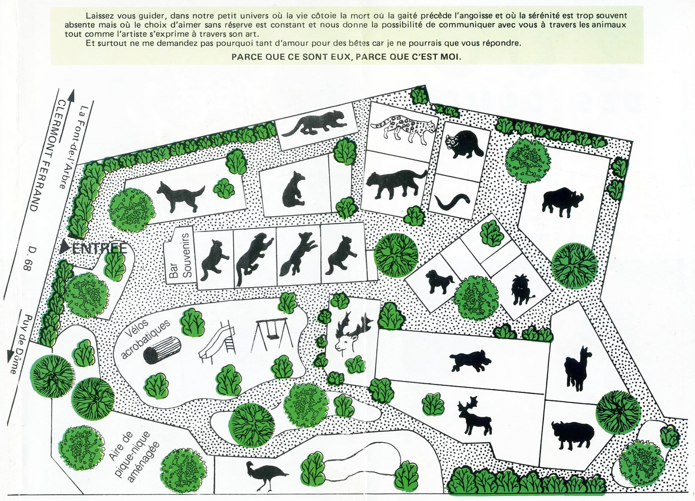 | Commentaire | Parc zoologique situé au pied du Puy de Dôme, propriétaire tué par un tigre en 1974 et affaire reprise par sa veuve, fermé définitivement en 2002, laissé de longues années à l'abandon et terrain finalement racheté par le Conseil départemental du Puy-de-Dôme en 2017, l'ensemble des installations restantes a été intégralement rasé en 2019 et le terrain a été transformé en pâtures pour animaux domestiques |