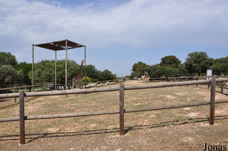 En continuant à longer l'enclos des éléphants, le visiteur retrouve l'installation des girafes. Des loups à crinière (Chrysocyon brachyurus) vivent dans deux enclos situés de l'autre côté du sentier. Une flore assez importante agrémentent cette installation et permet aux animaux de se dissimuler à la vue des visiteurs et de se protéger du soleil provençal. Un peu plus loin se trouve l'enclos des ânes (Equus asinus) à droite du sentier.
