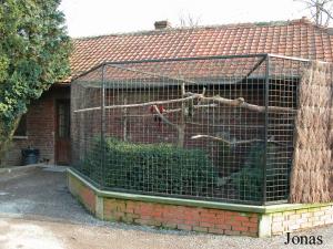 Des aras chloroptères (Ara chloroptera) sont présentés dans deux enclos à gros barreaux qui étaient autrefois occupés par des panthères. Un substrat d'écorces recouvre le sol tandis que quelques branchages offrent aux volatiles des possibilités d'évolution dans l'espace.