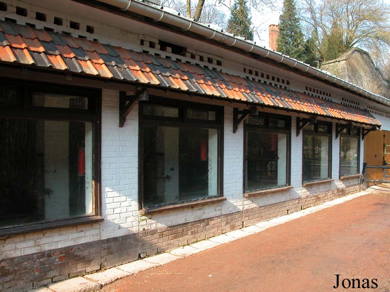 Un couple de chimpanzés (Pan troglodytes) est présenté dans une ancienne volière accolée à la paroi du fossé. Un petit bâtiment vitré se trouve à une extrémité de l'enclos et abrite deux loges intérieures.