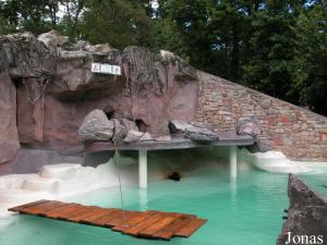 L'installation des mammifères marins, située un peu en contrebas, possède une histoire intéressante et très particulière. A peine une dizaine d'années après sa création, le Zoo Landau in der Pfalz présenta ses premiers ours, il s'agissait alors d'ours bruns. Quelques temps plus tard, des ours blancs vinrent compléter la collection. En 1969, la fosse de ces derniers fut rénovée et un couple de jeunes ours blancs fut accueilli en provenance du Zoo Karlsruhe voisin. En 1976, la femelle périt suite à une grave maladie et il fut décidé de vendre le mâle, alors seul, en raison du prix trop élevé du rachat d'une femelle. La fosse des ours polaires fut alors complètement transformée pour permettre la présentation d'otaries et de manchots. Un imposant groupe d'otaries à crinière (Otaria byronia) prit peu à peu possession des lieux. Une nouvelle rénovation dut être effectuée en 1986 suite à quelques problèmes de fuite et de défauts dans les fondations du bassin.